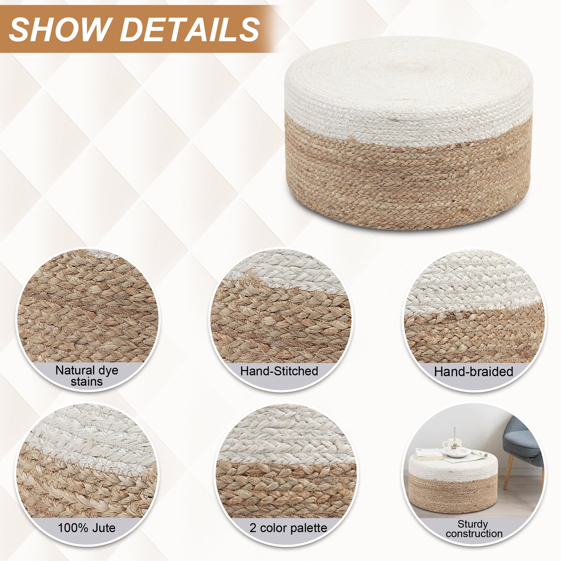 •Elegant Design: Delicate white top adds a touch of refinement and versatility to the pouf's aesthetic.